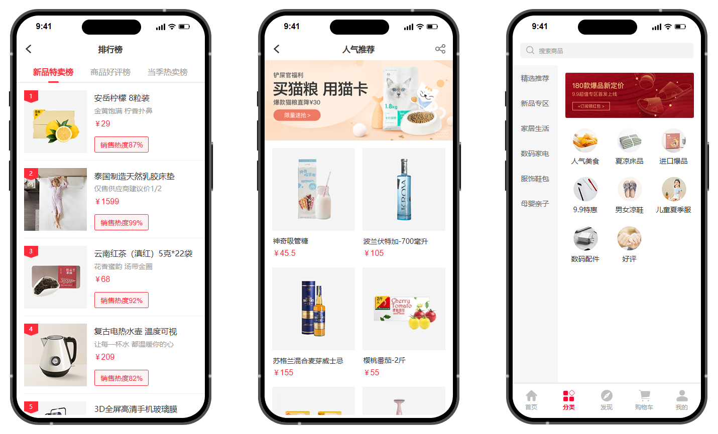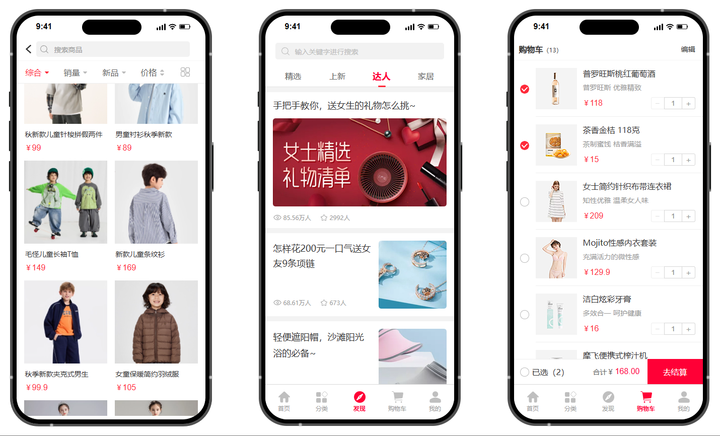 原型内容:包含引导页、登录页、注册页、首页、选品页、商品分类、 Banner轮播、推荐专区、搜索筛选、商品详情页、SKU选择、价格展示、评论模块、收藏与分享、购物车流程、增删商品、批量结算、价格计算、优惠券抵扣、订单结算、地址管理、支付方式(模拟支付宝/微信)、订单确认