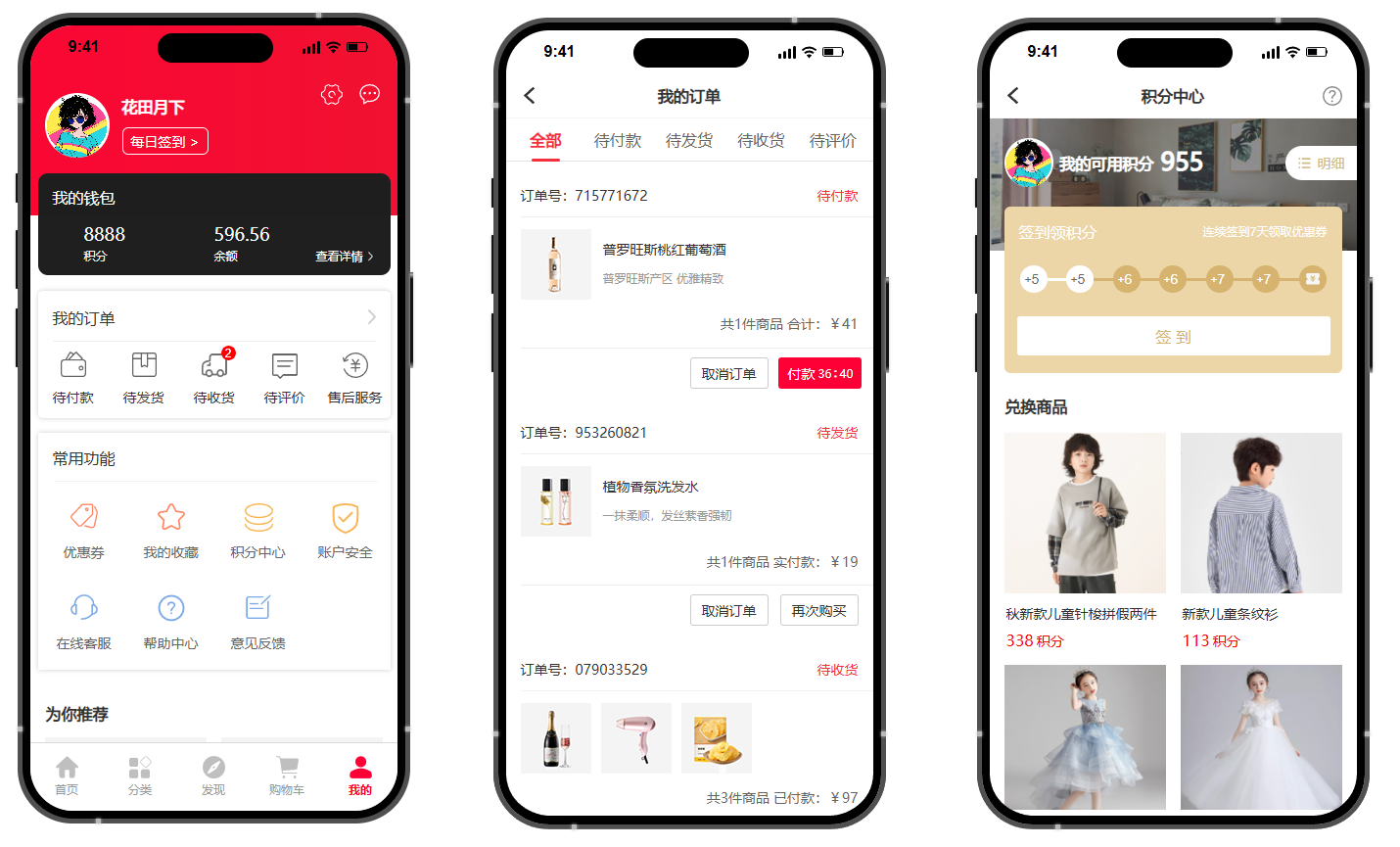个人中心、账号设置、订单管理、售后流程、消息通知等。