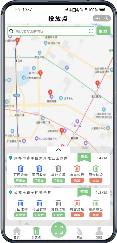 - 投放点详情:点击地图上的标记或列表中的投放点,可查看该投放点可回收物、有害垃圾等不同类型垃圾的投放情况和设备状态(如可投放、满溢)。
