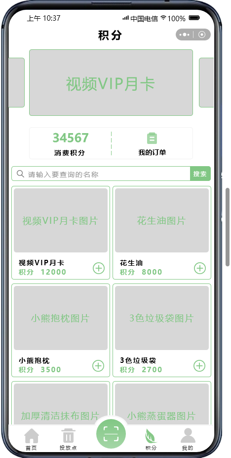 - 商品列表:展示可用积分兑换的商品,如视频 VIP 月卡、花生油、小熊抱枕、3 色垃圾袋等,每个商品标注所需积分和购买按钮。