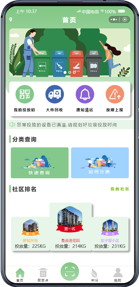 - 提示信息:动态展示与用户相关的提醒,如“您常投放的设备已满溢,请规划好垃圾投放时间”。